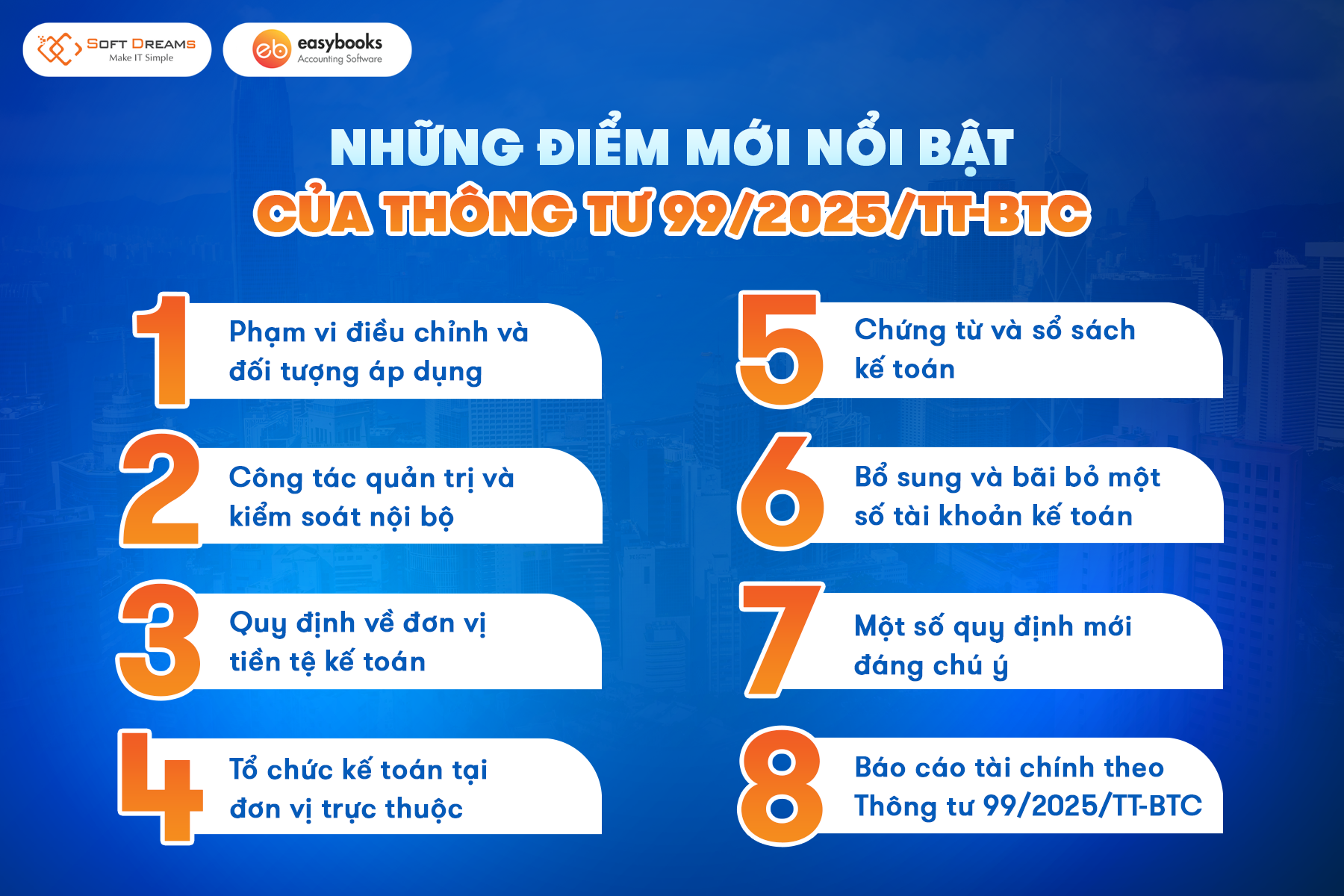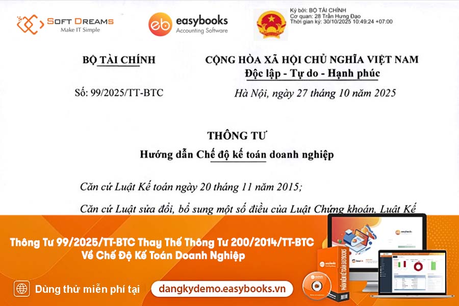Ngày 27/10/2025, Bộ trưởng Bộ Tài chính đã chính thức ban hành Thông tư 99/2025/TT-BTC, hướng dẫn chế độ kế toán doanh nghiệp thay thế Thông tư 200/2014/TT-BTC.Hãy cùng phần mềm kế toán EasyBooks tìm hiểu chi tiết những điểm mới quan trọng trong thông tư này qua bài viết sau đây!